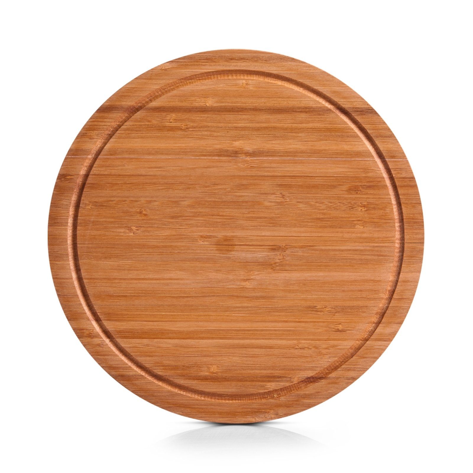 Dieses klassische runde Schneidebrett aus Bambus ist nicht nur ein optischer Blickfang, sondern bietet die ideale Grundlage zum Schneiden, Anrichten und Servieren Ihrer Köstlichkeiten. Das hochwertige Brett ist rundum mit einer Saftrille versehen und somit perfekt geeignet um z.B. Obst, Gemüse oder saftiges Fleisch zu schneiden. Für eine einfache Reinigung kann das Schneidebrett mit warmen Wasser, mildem Reinigungsmittel und einem Tuch abgewischt werden. Regelmäßiges Einreiben mit kalt gepresstem Speiseöl vermeidet das Eindringen von Feuchtigkeit und erhält Maserung und Farbe. Maße Ø 30 x 1,8 cm