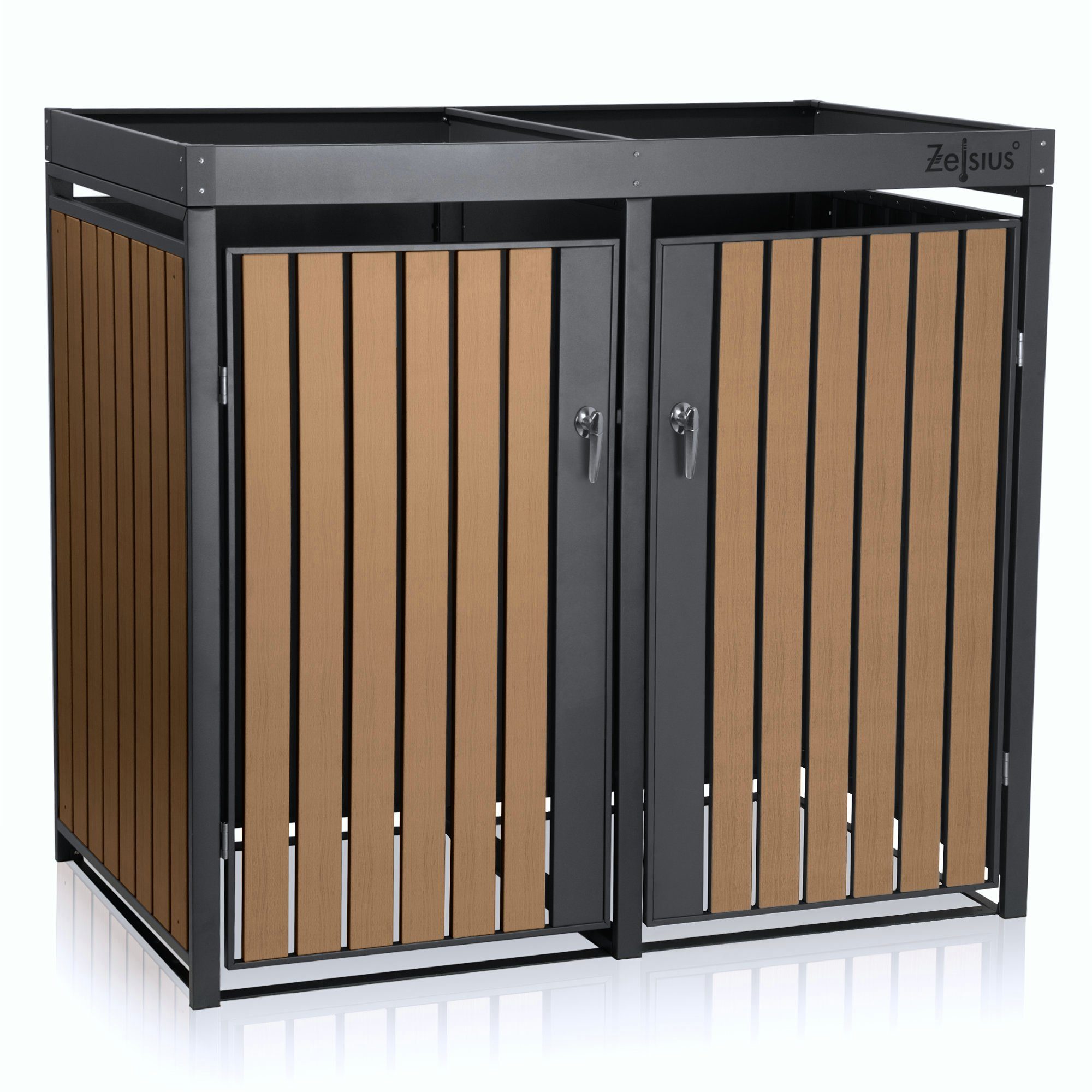 Unser Zelsius Mülltonnenkasten bietet Platz für zwei 120 - 240 l Tonnen und wertet nebenbei durch das moderne Holzdekor Ihre Hauseinfahrt optisch auf. Das Dach der Müllbox kann begrünt werden und ist somit ein echter Hingucker an Ihrem Haus.