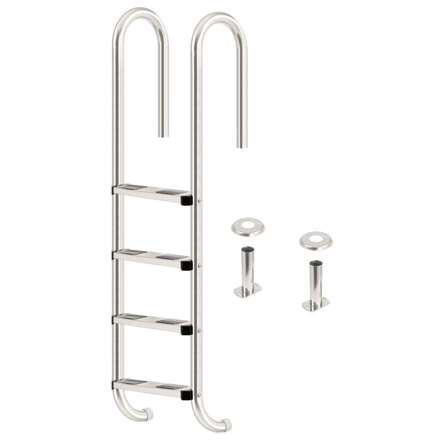 Highlights - Ideal geeignet für Pool und Schwimmbad - Farbe: Silber - Anzahl Stufen: 4 Stück, mit Rutschsicherung - Gesamtmaße: (B) 50 x (T) 26,5 x (H) 157 cm - Durchmesser Handlauf: Ø 42 mm - Material: V2A Edelstahl - Materialstärke: 1 mm - Gummistopfen als Füße - 2 Befestigungshülsen zur Montage auf Beton - Einfacher Aufbau durch detaillierte Montageanleitung - Rutschhemmende Trittstufe - Leichter Ein- und Ausstieg durch abgewinkelte Handläufe - Lieferumfang: Poolleiter mit 4 Stufen und Montage-Flansch-Set, Aufbauanleitung