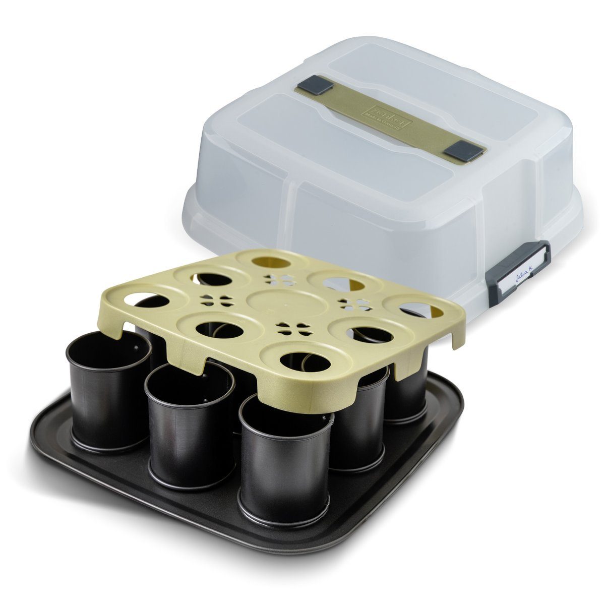 Der Clou an unserer Bake, Click & Go Serie ist die Haube, welche direkt nach kurzer Abkühlzeit auf die Backform gesetzt werden kann. So musst du nicht zwingend vor dem Transport den Kuchen stürzen oder zum Servieren umständlich aus der Form geholt werden. Mit unserer Bake, Click & Go Serie kannst du nach einer kurzen Abkühlzeit den Kuchen direkt aus dem Backofen mit zur nächsten Party nehmen. Neben klassischen Springformen ist die Produktpalette auch mit Backblechen oder originellen Törtchenblechen gespickt, auf die dieselbe Haube gesetzt werden kann.