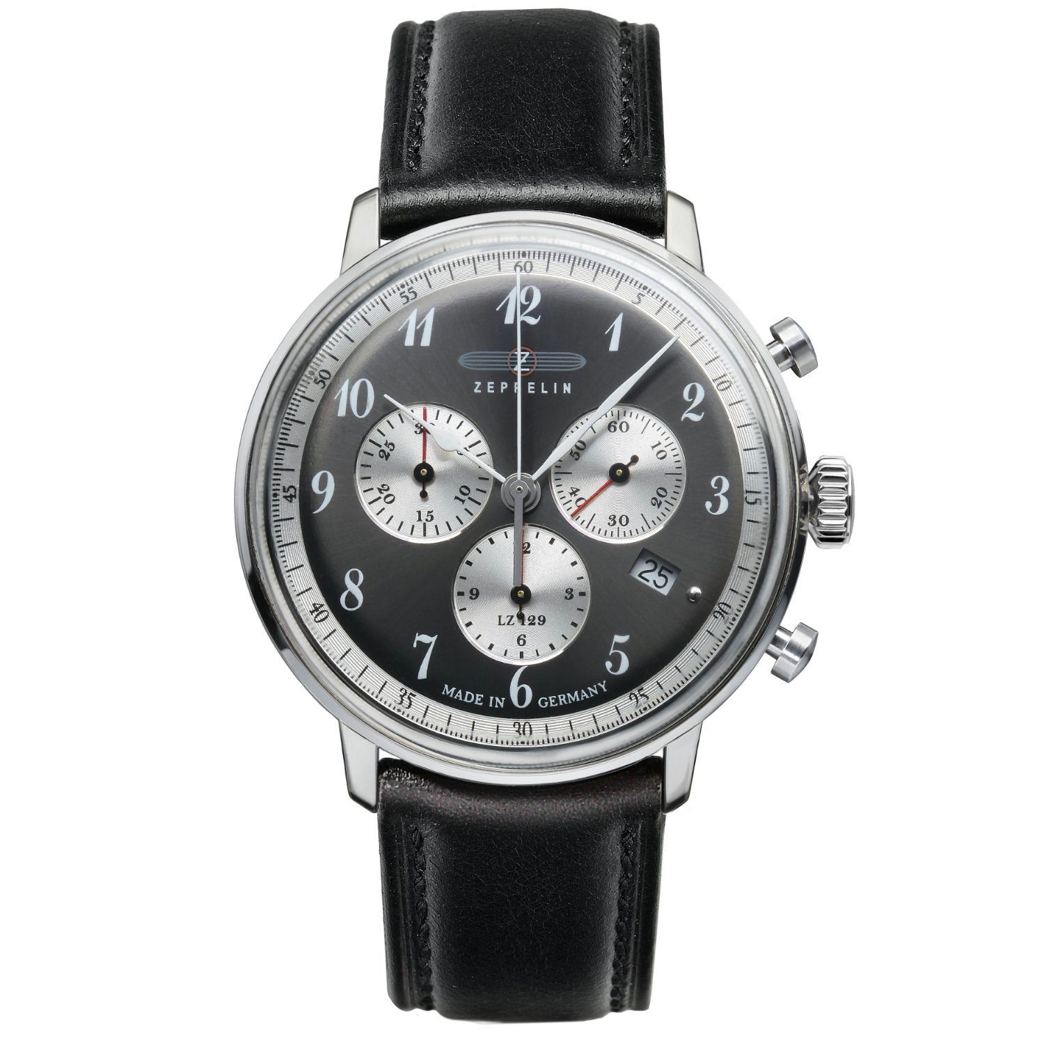 - LZ129 HINDENBURG - Werk Gehäuseboden Funktionen Quarz - Swiss Technology Edelstahl Stunde, Minute, kleine Sekunde Ronda 5030.D geschraubt Chronograph 12Std. + 30 Min. Zähler Gehäuseform Uhrenglas Add und Split Funktion Rund Hesalitglas Datum Gehäusedurchmesser Wassergeschützt ca. 40mm 3 ATM Gehäusehöhe Armbandmaterial ca. 10mm Leder Gehäusematerial Armbandmaße Edelstahl 20mm Stegbreite max. Armumfang ca. 22cm Gehäusefarbe silber Armbandfarbe schwarz MADE IN GERMANY Zifferblatt anthrazit Verschluss Dornschließe
