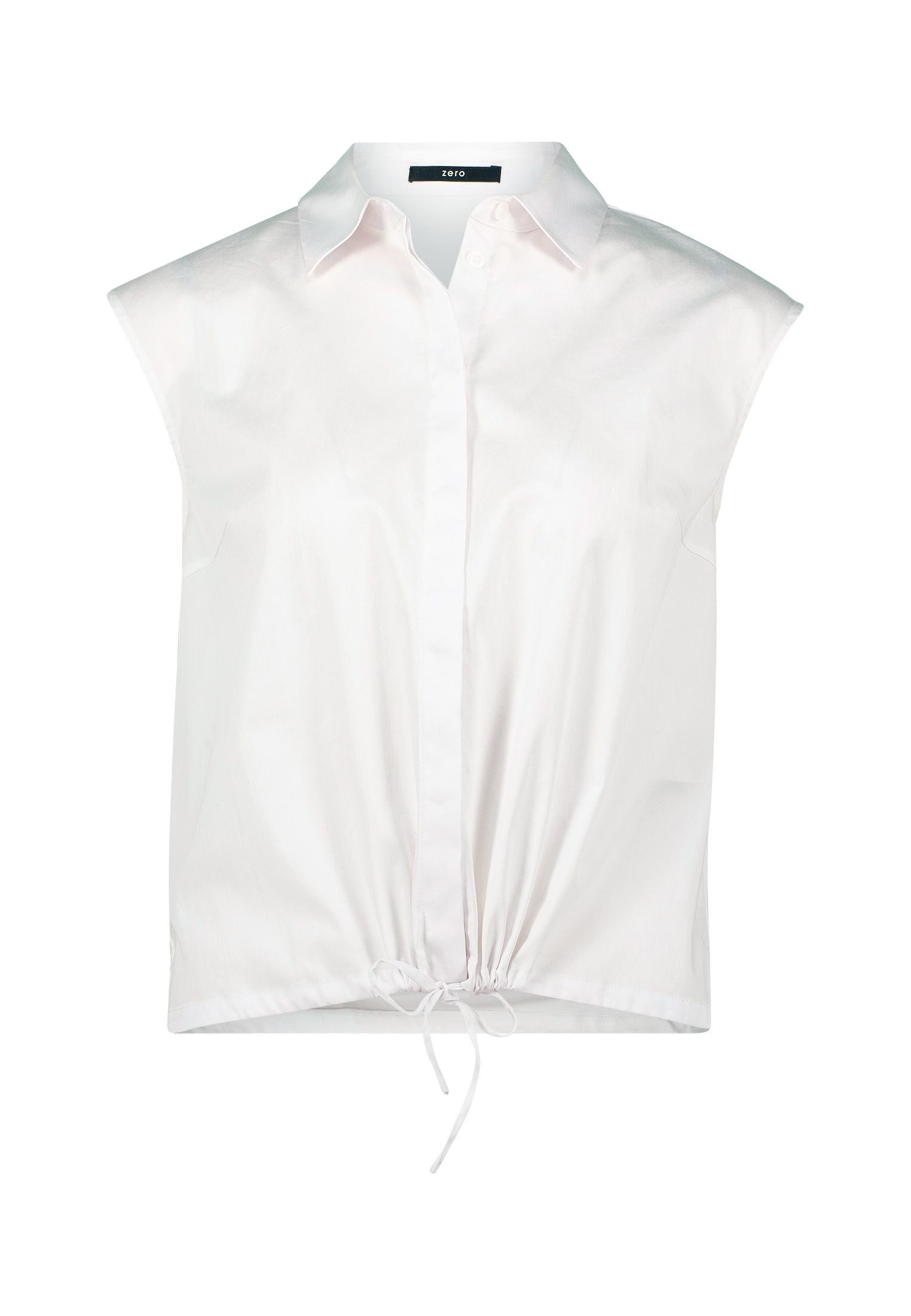 Diese ärmellose Bluse von zero überzeugt mit femininen Details und sommerlicher Leichtigkeit. Der klassische Hemdkragen trifft auf eine durchgehende Knopfleiste und ein charmantes Bindeband am Saum – ideal für einen frischen, casual Look. Die figurbetonte Passform und die normale Длина machen sie zum vielseitigen Stylingpartner für Alltag und Freizeit.