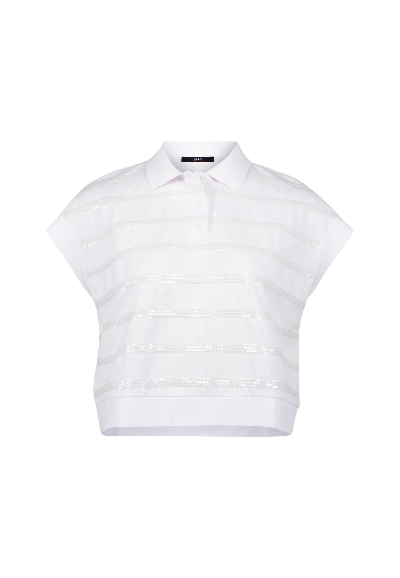 Dieses figurbetonte Poloshirt bringt klassischen Chic und einen Hauch Glamour zusammen. Der typische Polokragen und die Knopfleiste sorgen für eine sportive Grundform, während dezente Pailletten-Details raffinierte Akzente setzen. Die kurze Длина und der schmale Schnitt unterstreichen die feminine Silhouette und machen das Shirt zu einem stilvollen Begleiter für den Alltag.