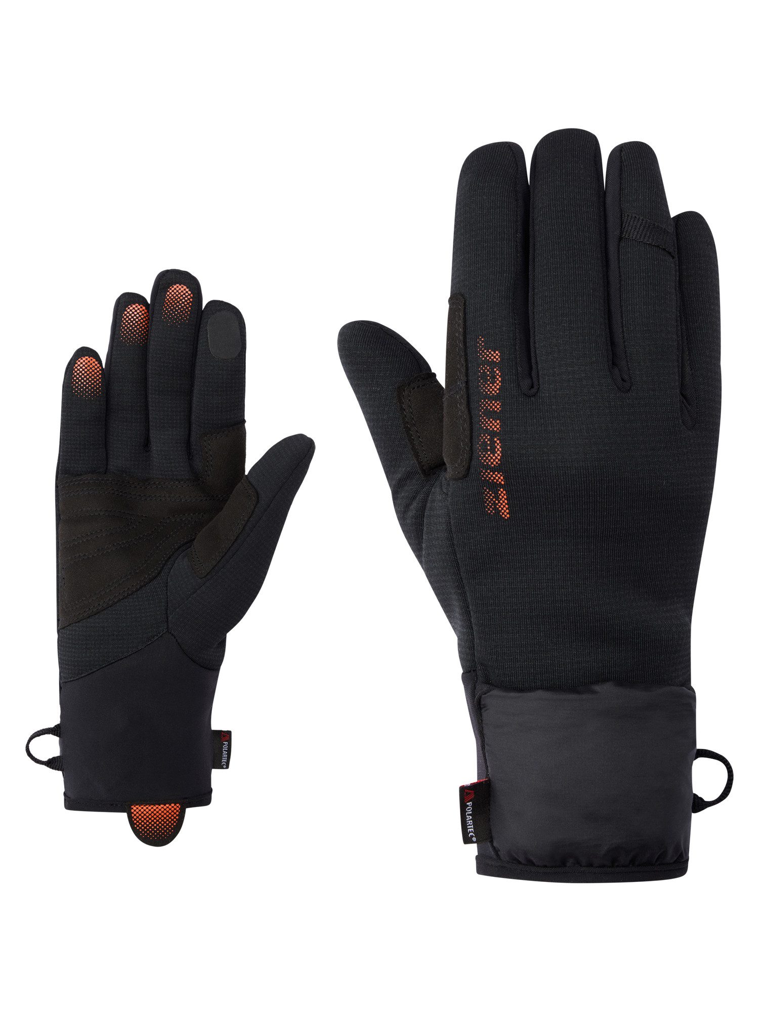 Die technischen ZIENER Multifunktionshandschuhe IZELAND-Z TOUCH eignen sich für optimal für Aktive Wintersportarten. Durch den integrierten Überzieh-Fäustling aus ZIENER WINDSHIELD® Material können Plus- oder Minusgrade gut ausgegleichen werden. Die Überzieh-Fäustlinge sind in einer kleinen Tasche auf der Oberhand verstaut und bieten einen hervorragenden Windschutz sobald die Finger kalt werden. Die innovative, nahtreduzierte Schnittführung und eine besonders stabile Verarbeitung aus hochwertigen Materialien machen sie zu zuverlässigen Begleitern bei alpinen Unternehmungen. Das windabweisende, elastische POLARTEC® Material sorgt für besonders hohen Tragekomfort und macht die Handschuhe weich und geschmeidig. Die rutschfeste, bedruckte Innenhand sorgt für eine hohe Griffigkeit. Das Smartphone kann mit Hilfe der TOUCH Funktion am Zeigefinger kinderleicht bedient werden. Die praktische Ausziehhilfe am Bund kann auch zum Befestigen an der Hose genutzt werden. Zum Beispiel mit dem mitgelieferten kleinen Karabiner.