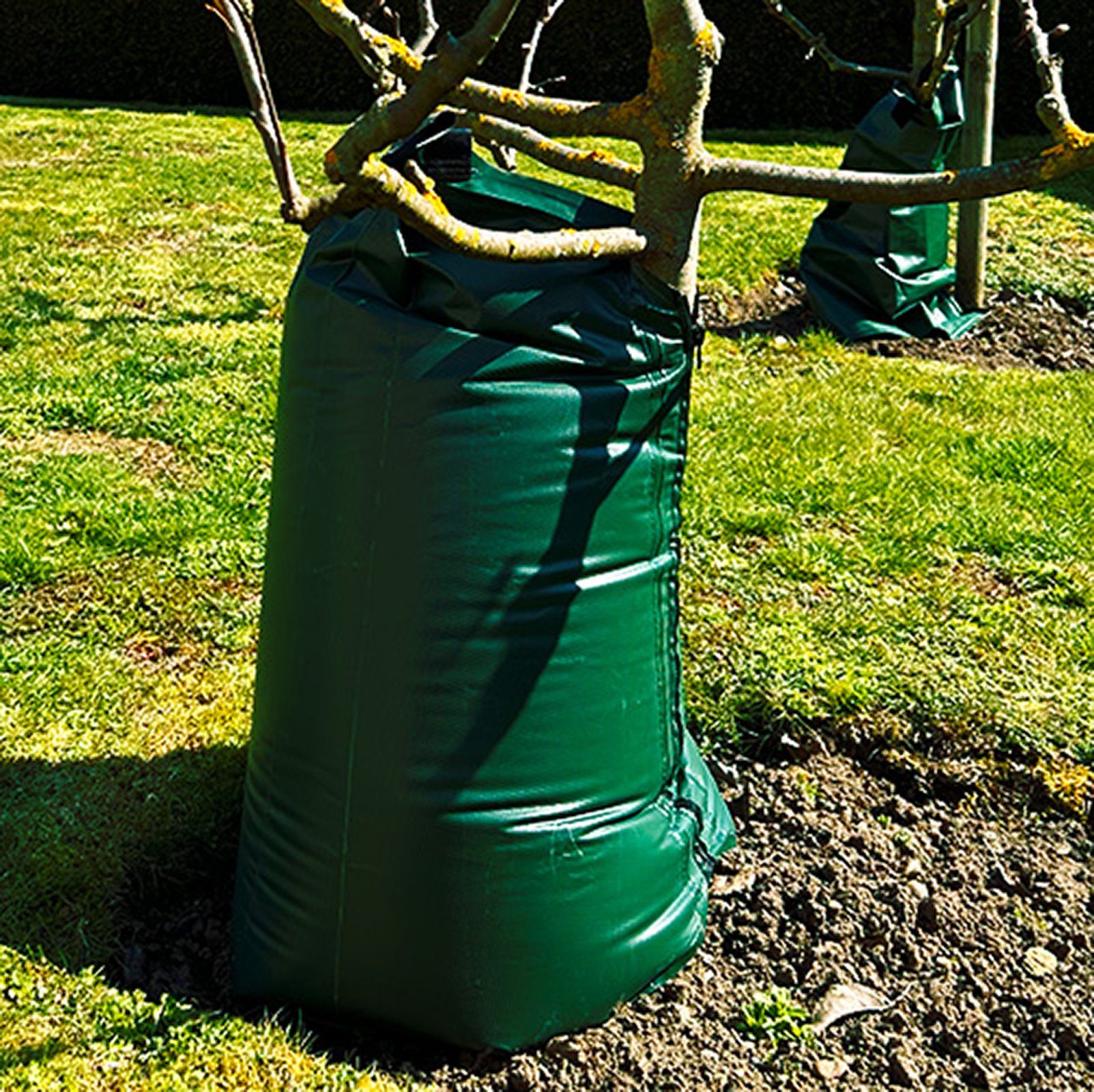 Der Baumbewässerungssack schützt junge Bäume während trockener Phasen. Um den Baum oder Strauch herum wird der Wasser-Sack platziert, anschließend wird der Reißverschluss geschlossen und der Sack mit Wasser gefüllt. Auf diese Weise gibt der Bewässerungsbeutel das Wasser gleichmäßig über den Tag hinweg direkt an die Wurzeln der Pflanze ab. Dank der kleinen Tropflöcher am Boden des Bewässerungs-Sacks erfolgt die Abgabe des Wassers kontinuierlich und kann bis zu 9 Stunden dauern, was eine gründliche Bewässerung gewährleistet. Dies führt nicht nur zu Wasserersparnissen, sondern schützt auch junge Bäume und Sträucher vor Trockenheit und Staunässe.