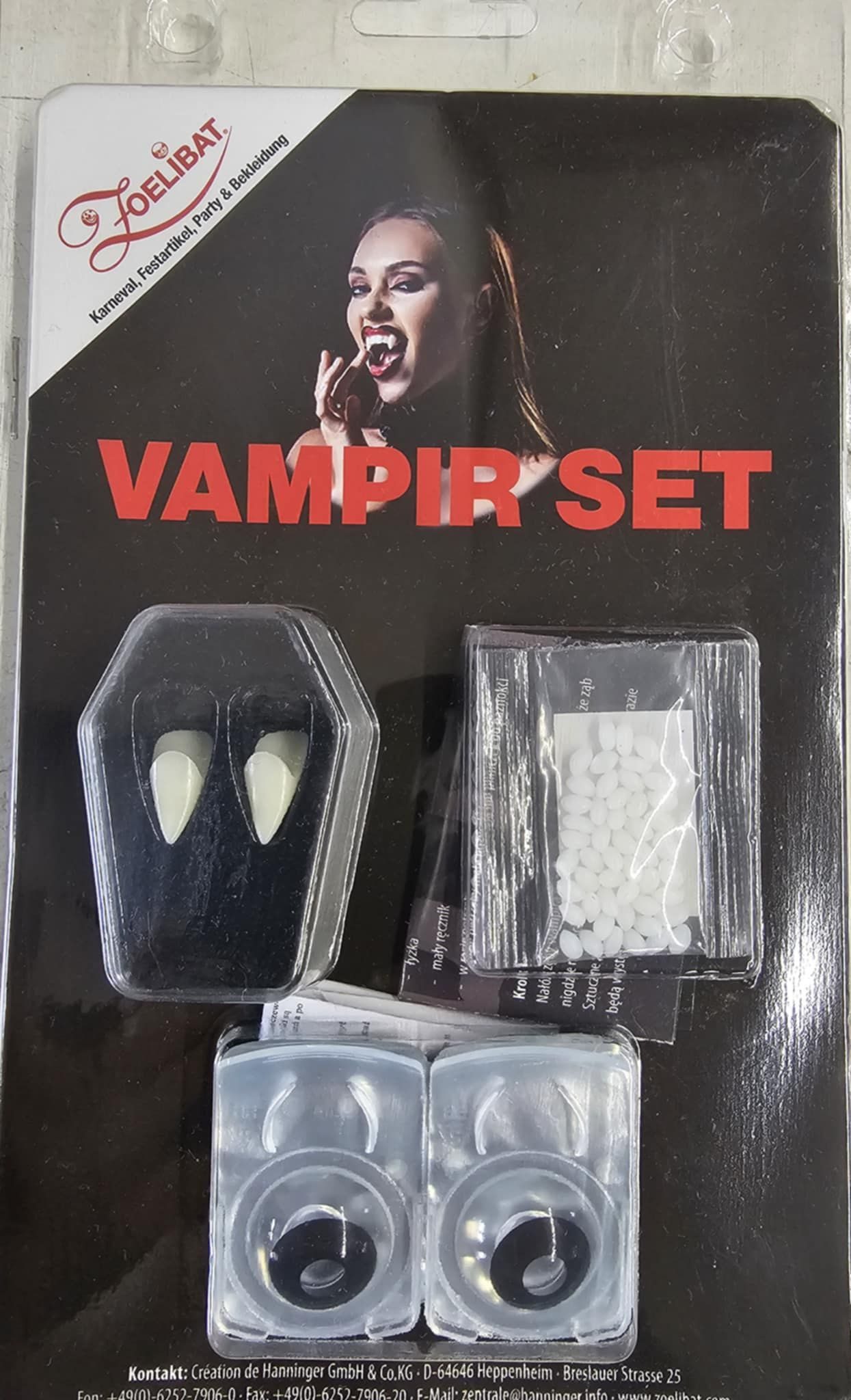 Top Angebot: 2-tlg Vampir Set mit 1 Paar Kontaktlinsen Schwarz & 2 Vampirzähne. Top Angebotspreis, nur 50 Sets lagernd. 1 Paar Vampirzähne. 1 Paar Kontaktlinsen Schwarz. Fantasy Linsen Halloween Karneval Party oder - egal ob für Events oder den Alltag. Diese Linsen können täglich getragen werden bis zu 12 Stunden. Lieferung: 2 Stück ( 1 Paar ) weiche Linsen 14,5 mm Radius 8,6 mm. Material Linsen: 58% Polyhema, 42% H2O in gepuffter Kochsalzlösung. Mehr Informationen auf dem Beipackzettel. Behälter 100% Kunststoff. Achtung ! Dies ist kein Spielzeug. Geeignet ab 18 Jahren. Es handelt sich bei dem Artikel um ein Hygieneprodukt - daher Rückgabe nur ungeöffnet möglich. Die Kontaktlinsen sind für den Straßenverkehr nicht geeignet. Für Kinder unzugänglich aufbewahren. Die Linsen sind Steril verpackt bist zum ersten Öffnen. Für Halloween Fasching, Karneval, Mottoparty Weihnachten und andere Gelegenheiten.