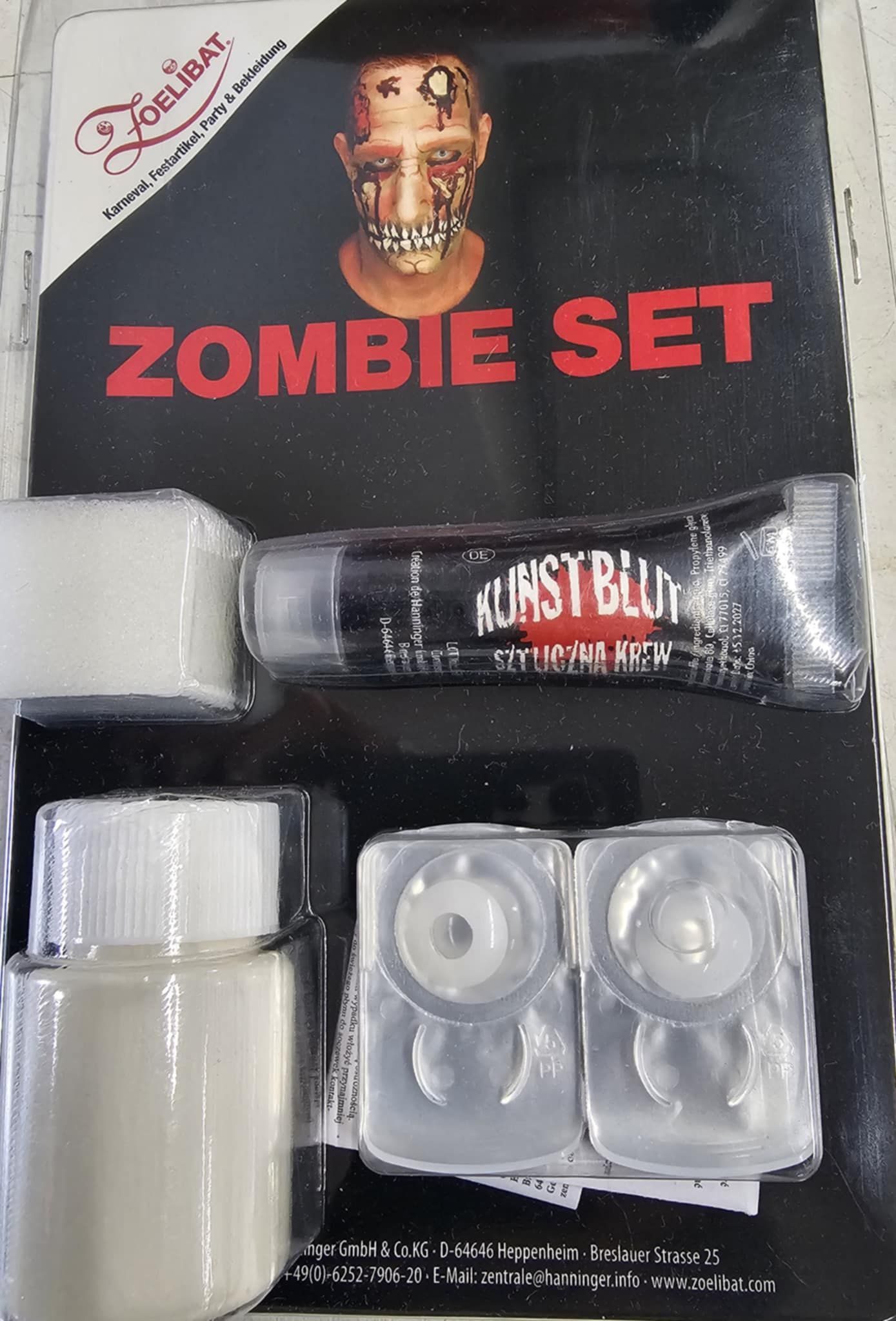 Top Angebot: 4-tlg Zombie Set mit 1 Paar Kontaktlinsen Weiß, 1 x Kunstblut, 1 x Flüssiglatex, 1 x Schwamm. Top Angebotspreis, nur 50 Sets lagernd. 2 x Weiße White Zombie Kontaktlinsen. 1 x 15 ml Kunstblut, Inhaltstoffe: Auqa,Popylene glycol, Polysorbate 80, Cellulose gum. 1 x 28,3 ml Flüssiglatex für Narben, Hautfetzen und Warzen Inhaltstoffe: Rubber Latex, Water,Ceresin wax, Triethanolamine, Ammonia, CI 15850 1 x Schwamm. Fantasy Linsen Halloween Karneval Party oder - egal ob für Events oder den Alltag. Diese Linsen können täglich getragen werden bis zu 12 Stunden. Lieferung: 2 Stück ( 1 Paar ) weiche Linsen 14,5 mm Radius 8,6 mm. Material Linsen: 58% Polyhema, 42% H2O in gepuffter Kochsalzlösung. Mehr Informationen auf dem Beipackzettel. Behälter 100% Kunststoff. Achtung ! Dies ist kein Spielzeug. Geeignet ab 18 Jahren. Es handelt sich bei dem Artikel um ein Hygieneprodukt - daher Rückgabe nur ungeöffnet möglich. Die Kontaktlinsen sind für den Straßenverkehr nicht geeignet. Für Kinder unzugänglich aufbewahren. Die Linsen sind Steril verpackt bist zum ersten Öffnen. Für Halloween Fasching, Karneval, Mottoparty Weihnachten und andere Gelegenheiten.