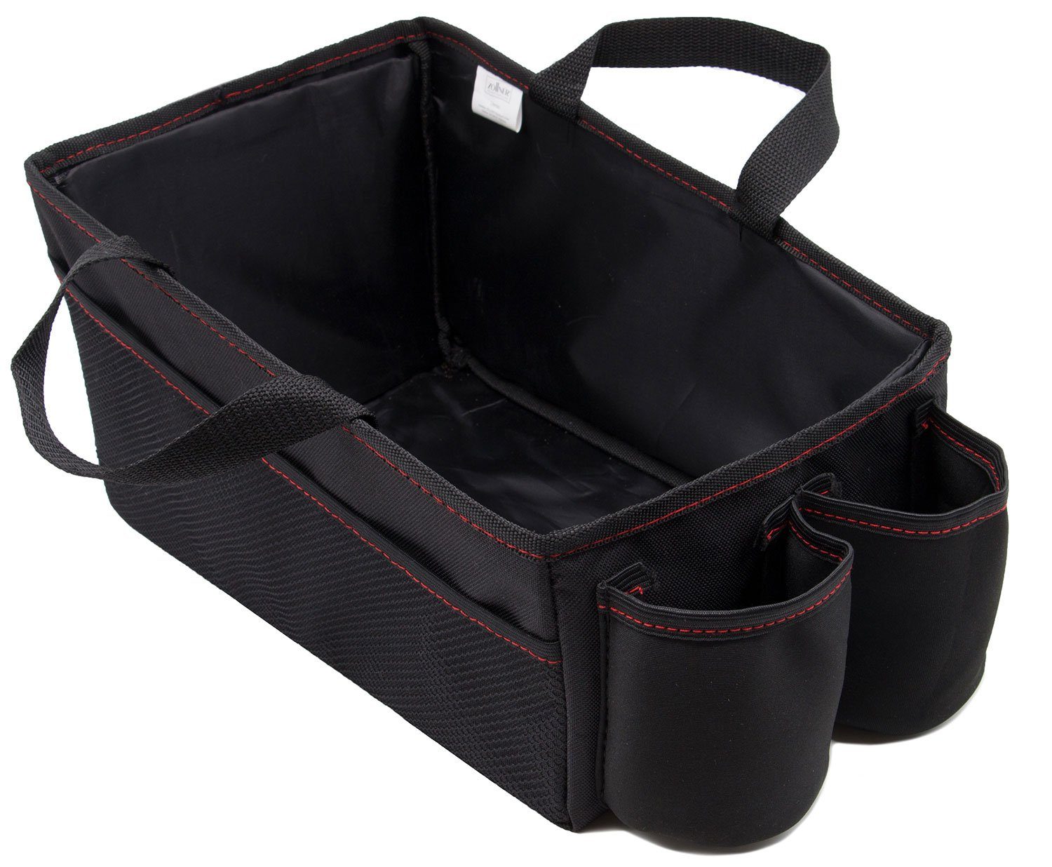 Sorgen Sie für zusätzlichen Stauraum und Ordnung in Ihrem Auto mit der Utensilien Tasche in schwarz und roten Nähten. Durch die stilvoll gewählte Farbkombination, wirkt der Organizer zudem noch sehr schick und elegant.