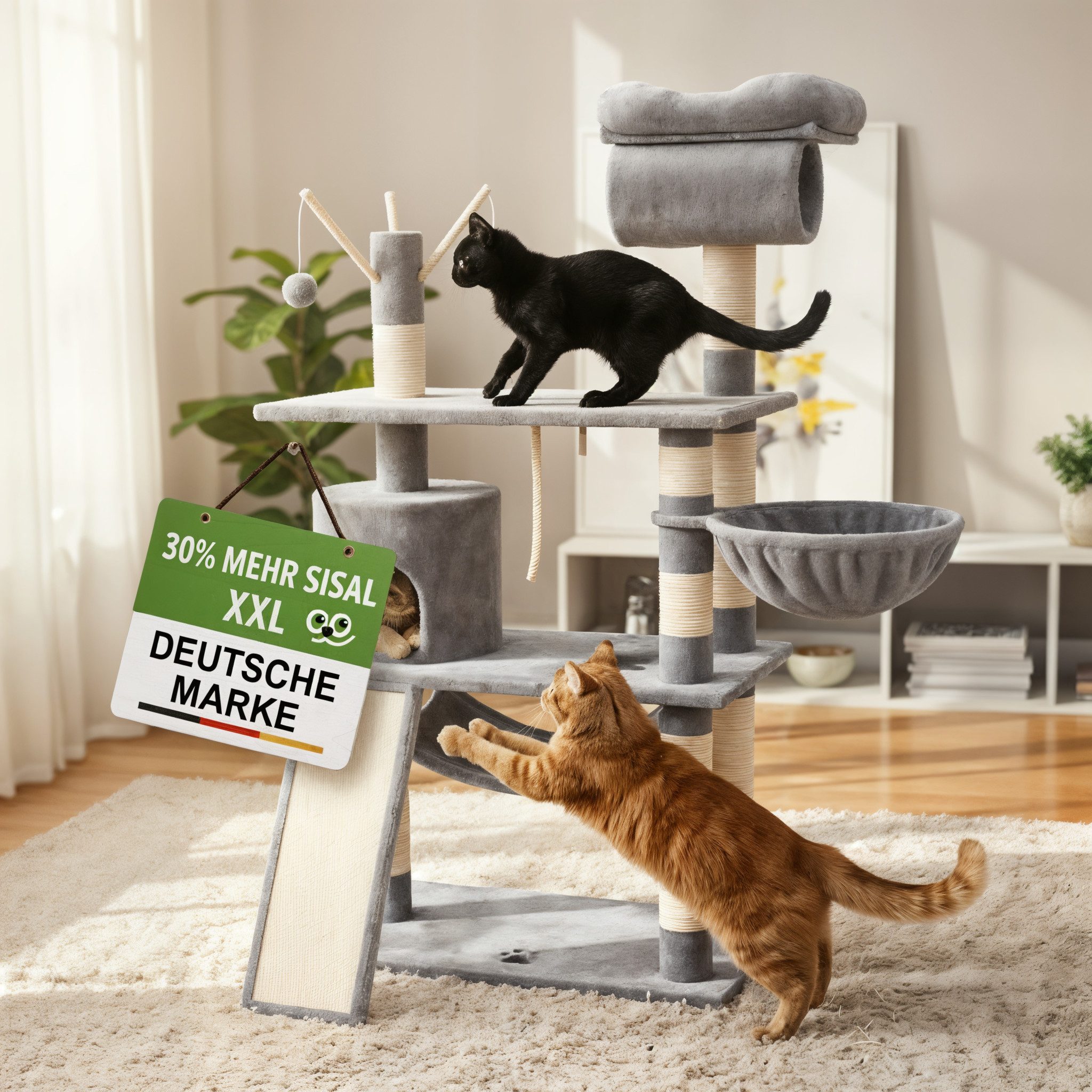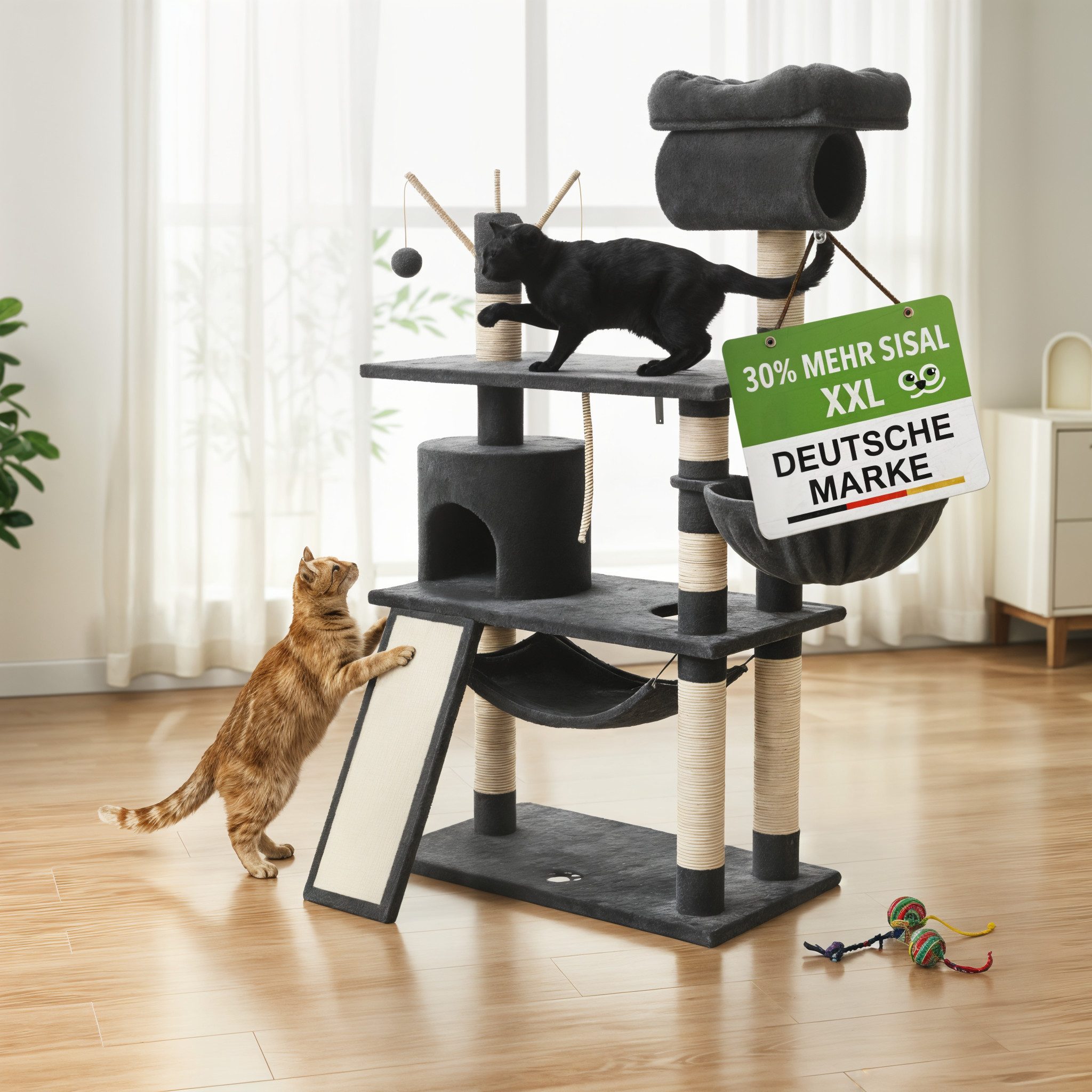Unser extra breiter XXL Premium Katzenbaum „Emma“ ist ein wahrer Rückzugsort für Ihren Stubentiger. Mit robusten, dicken Sisal-Säulen, gemütlichen Kuschelhöhlen, einer bequemen Hängematte sowie spielerischen Bällen und Seilen bietet dieser Katzenbaum alles, was das Herz Ihrer Katze begehrt.
