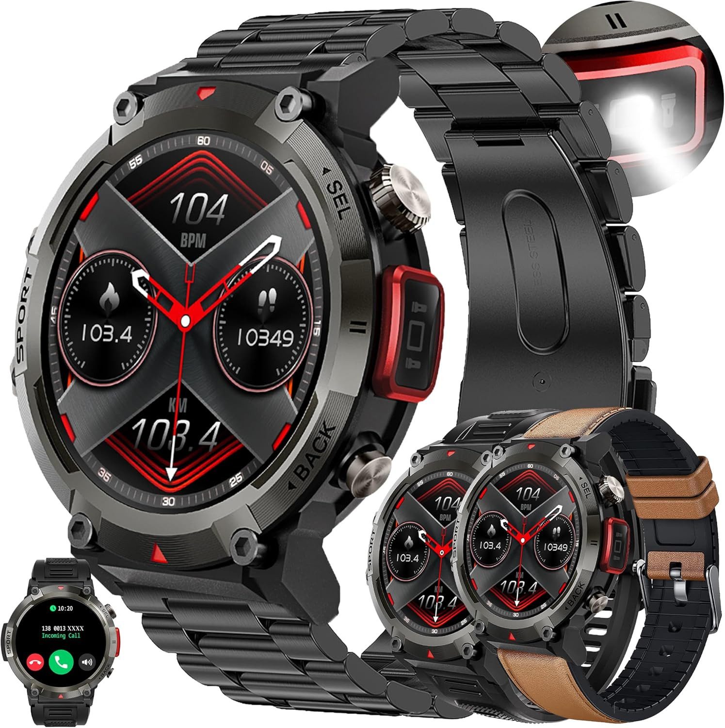 Die Smartwatch verfügt über Lautsprecher und Mikrofon, sodass Anrufe ohne Smartphone möglich sind. Musik kann direkt über die Uhr abgespielt werden – ideal beim Radfahren oder Klettern. Drei Armbänder aus Edelstahl, Leder und Silikon sorgen für Flexibilität bei jedem Anlass.