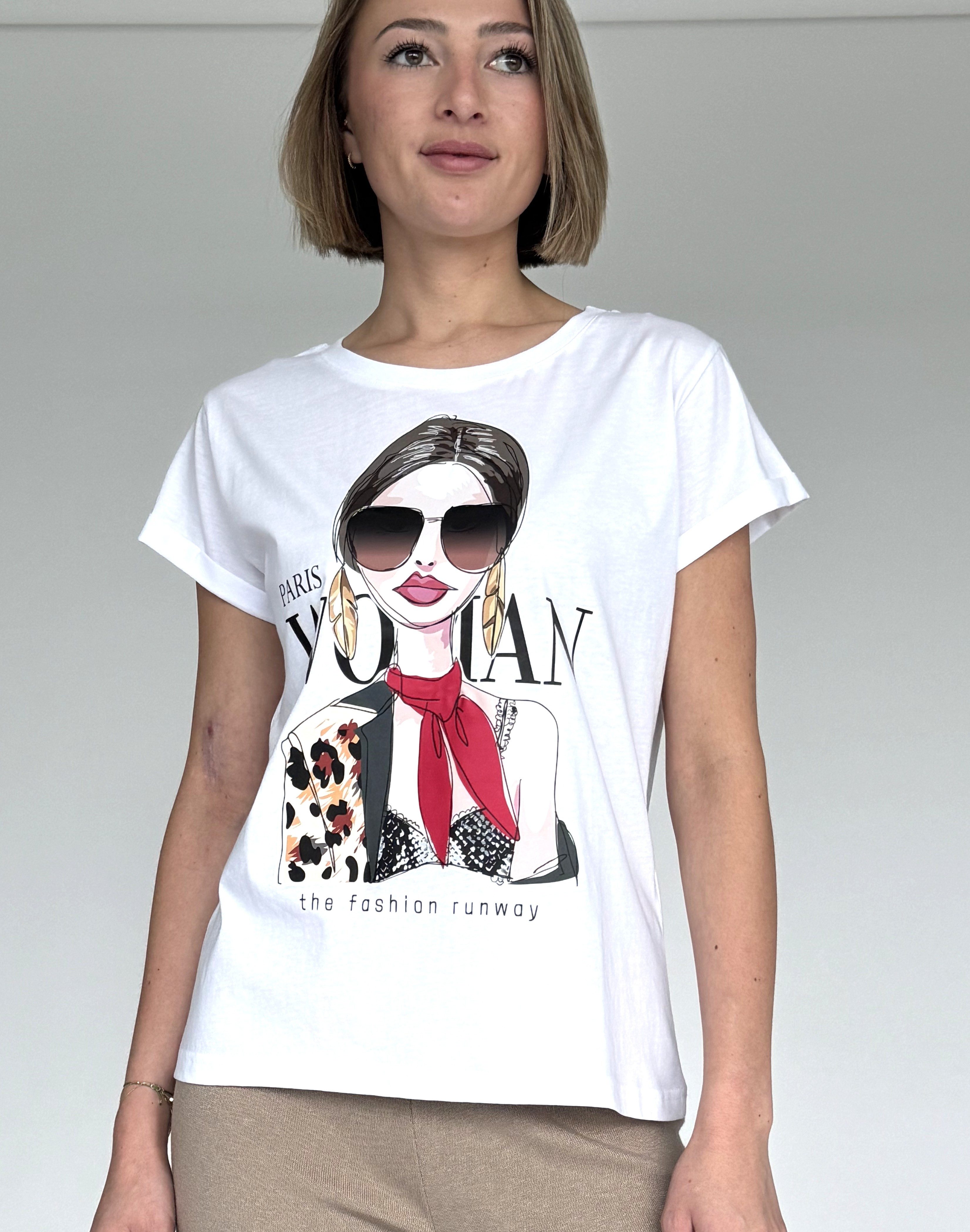 Besondere Merkmale | Rundhalsshirt, modischer Frontprint "Paris Woman", aus 100% Baumwolle |