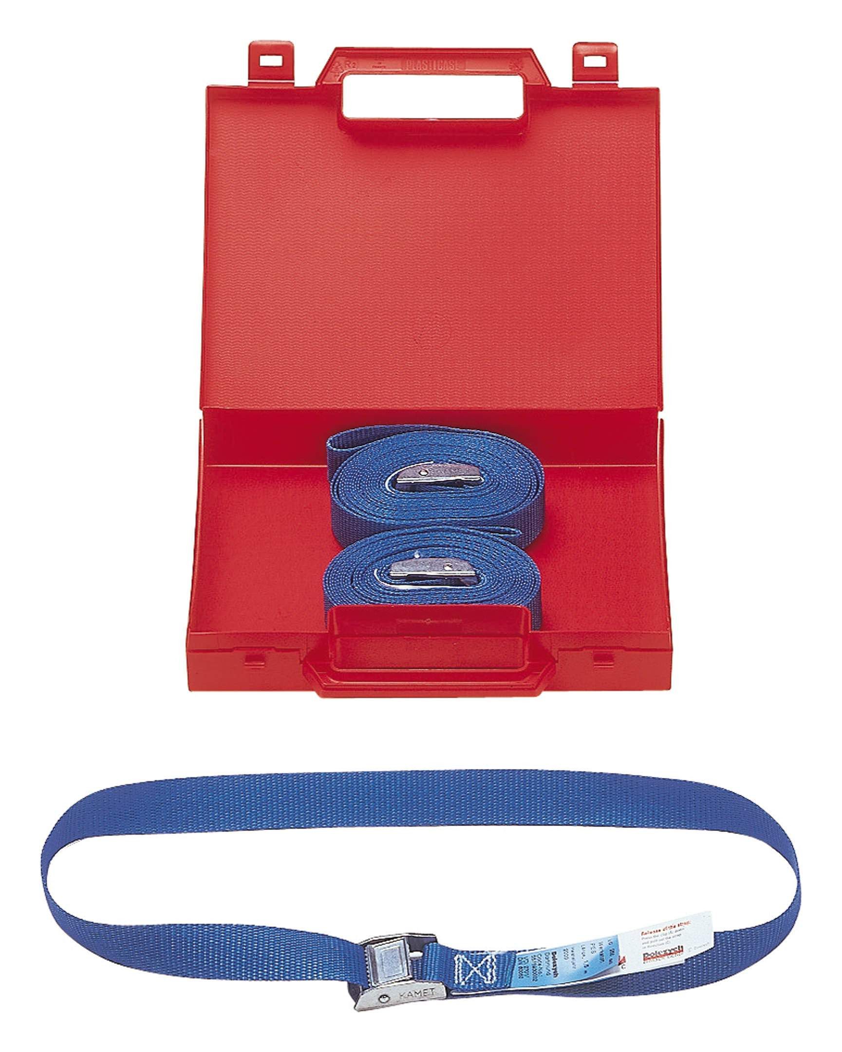 Lieferumfang | 2 Klemmschloss-Zurrgurte (einteilig), 5 m Umfang (nach VDI 2701), im Kunststoffkoffer |
