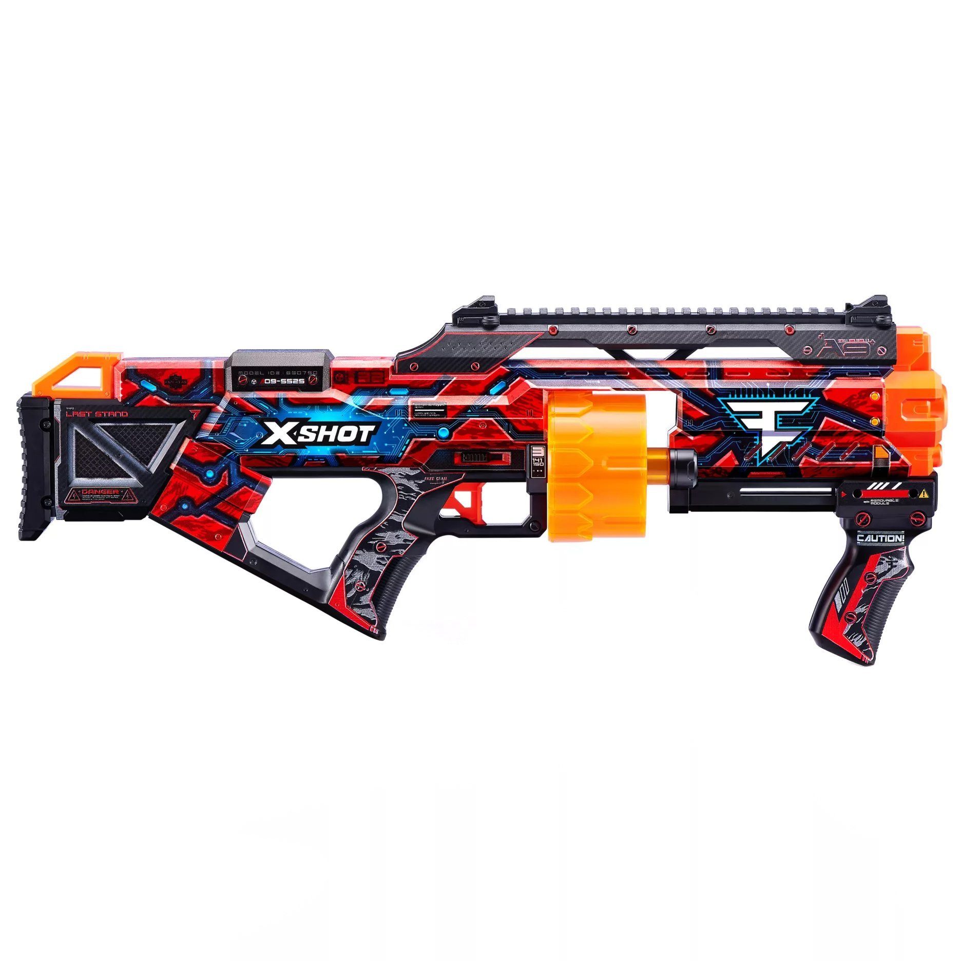 X-Shot Skins bringt das Spielerlebnis, deinen Blaster zu skinnen, in die reale Welt. Wähle deinen Skin und zieh in die Schlacht. Der X-Shot Skins Last Stand FaZe Clan ist der größte Blaster in der Skins-Reihe und vereint epische Feuerkraft, Geschwindigkeit und Präzision in einem Blaster. Mit dem automatisch rotierenden Lauf mit einer Kapazität von 14 Darts kannst du mehrere Ziele auf bis zu 27 m treffen. Dank des einfach zu bedienenden Spannmechanismus lassen sich 14 Darts in Sekundenschnelle abfeuern. Der Last Stand wird mit einem taktischen Griff und einer Schiene zum einfachen Laden geliefert und ermöglicht es dir, deinen Blaster mit Zubehör aufzurüsten. Der X-Shot Skins Last Stand Blaster kommt in 3 einzigartigen Skins zum Auswählen und Sammeln. Wähle anders, wähle X-Shot Skins.