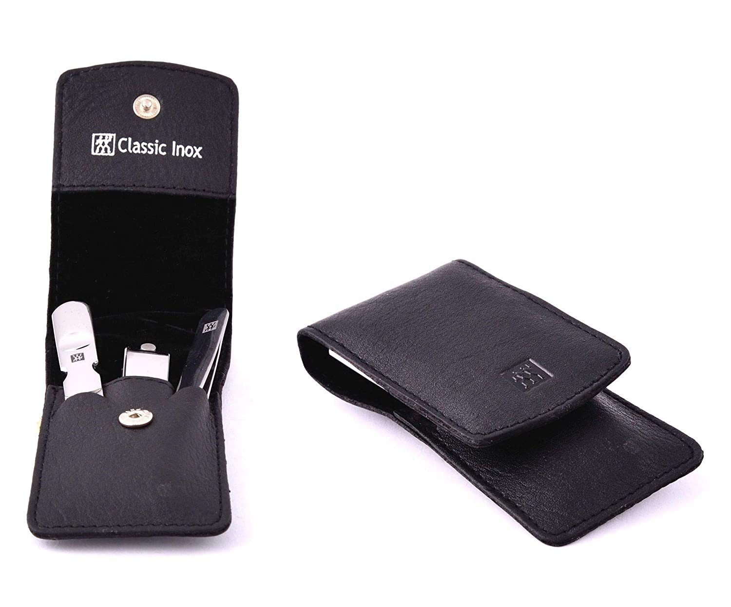 Zwilling CLASSIC INOX Maniküreset Manicure Etui Nagelpflege Taschen-Etui, Rindleder, schwarz, 3-tlg. Mit der neu entwickelten Manicure-Serie ZWILLING Classic Inox machen Sie Ihre Körperpflege zum individuellen Wellness-Programm. ZWILLING Classic Inox weiß mit edlen, polierten Instrumenten und hochwertigen Lederetuis auch optisch zu gefallen. Das umfangreiche Меню enthält alle Instrumente, die Sie sich für Ihre tägliche Körperpflege wünschen. Taschenetui aus hochwertigem Rindleder mit Druckknopfverschluss Geprägtes ZWILLING – Logo auf Druckverschluss Edelstahl rostfrei, poliert Inhalt: 3-teilige Classic Inox Bestückung: Nagelknipser Pinzette, schräg Nagelfeile 90mm Verpackt in Klarsichtfaltschachtel