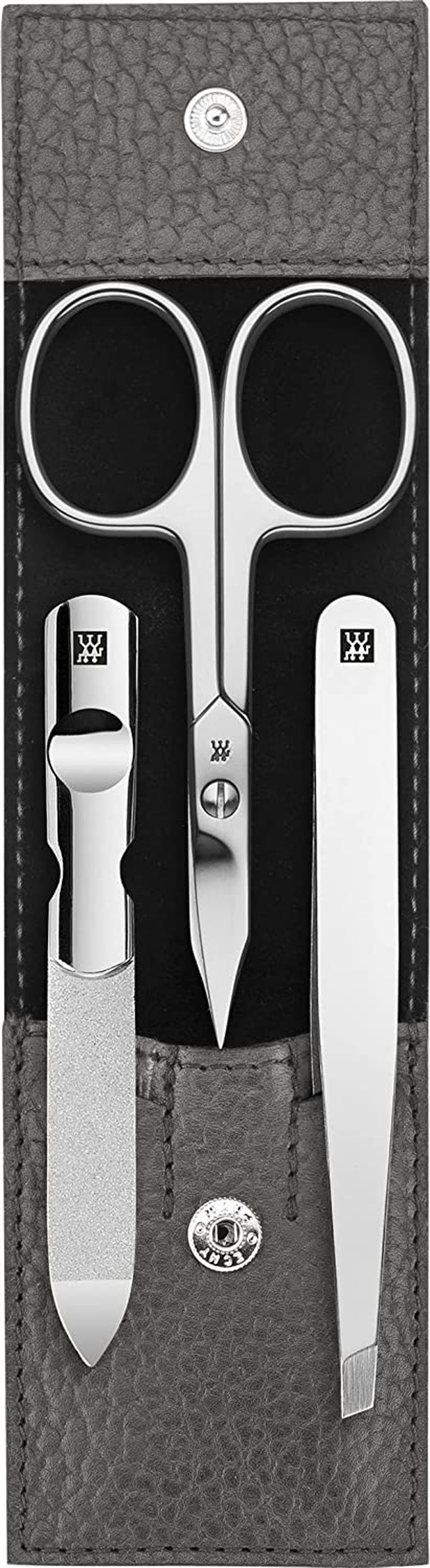 ZWILLING Maniküreset 3-teilig für Nagelpflege und Pediküre aus Rindleder mit Druckknopf, inkl. Nagelschere, Anthrazit Pure Eleganz: 3-teiliges Set mit den wichtigsten Nagelpflege-Instrumenten für die tägliche Maniküre und Pediküre aus der CLASSIC INOX Serie Material & Design: Anthrazitfarbenes Rindleder-Etui mit Druckknopfverschluss und innenseitigem Samtbezug; Perfekte ergonomische Form der Instrumente; Optimaler Begleiter für unterwegs oder auf Reisen Höchste ZWILLING Qualität: Die Instrumente sind aus aus qualitativ sehr hochwertigem, rostfreiem, matt satiniertem Edelstahl gefertigt; Zudem Korrosionsbeständig Das perfekte Geschenk: Ob Sie selbst auf der Suche nach einem hochwertigem Set sind oder liebe Menschen um Sie herum beschenk möchten; Mit dem ZWILLING Maniküre und Pediküre Set, bereiten Sie immer Freude, zB; zu Weihnachten, Valentinstag oder zum Geburtstag Lieferumfang: Bestehend aus einer 2-in 1 Kombi-Nagelschere für Nägel und Nagelhaut, Saphir-Nagelfeile und einer schrägen Pinzette