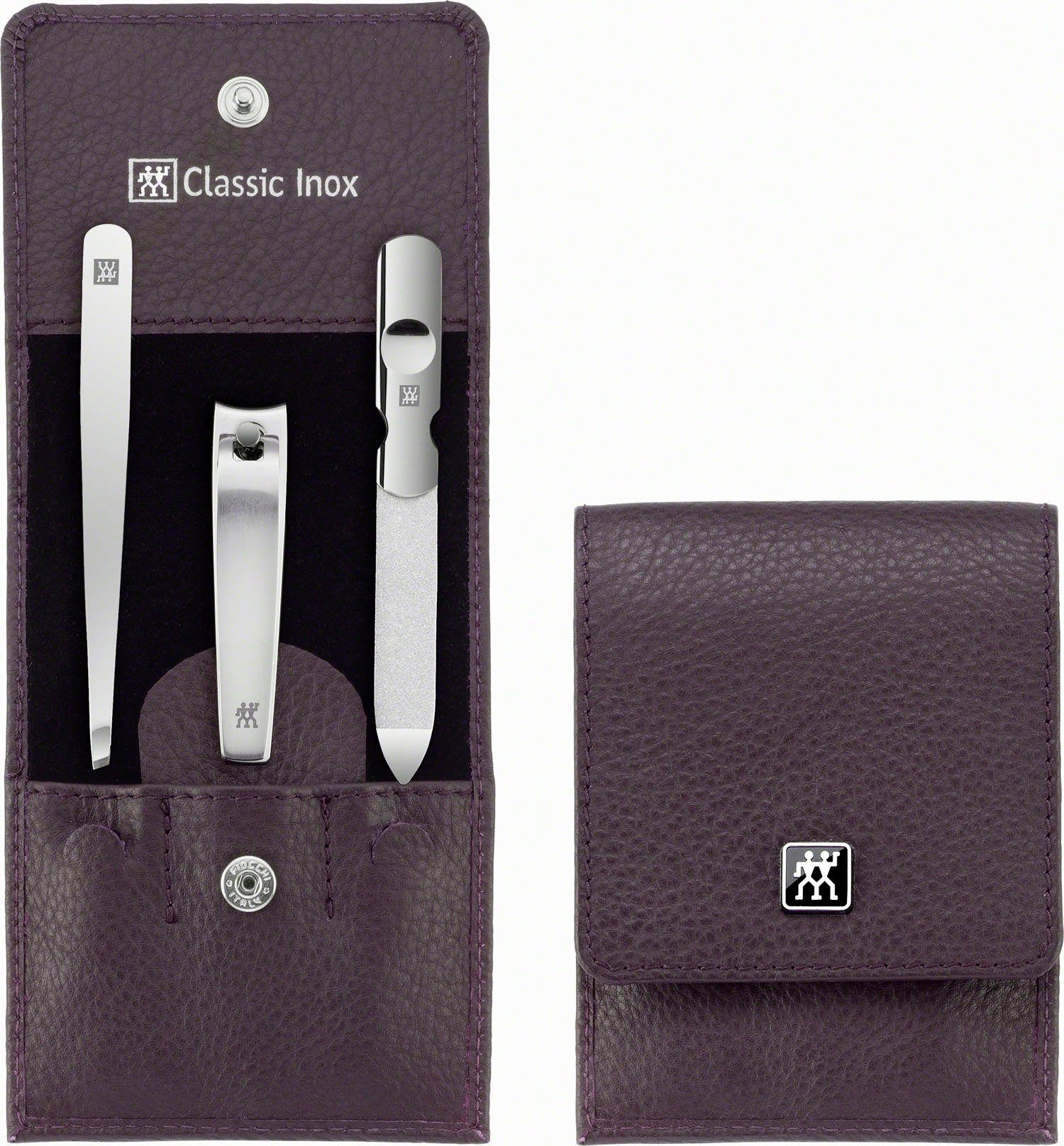 ZWILLING Classic INOX Taschen-Etui 3tlg Mit dem 3-teiligen Taschen-Etui aus der Serie ZWILLING® Classic Inox besitzen Sie alles, was Sie für die umfassende Pflege Ihrer Nägel und Brauen benötigen: einen Nagelknipser, eine schräg geformte Pinzette, und eine Saphir-Nagelfeile. Все Instrumente sind aus rostfreiem und poliertem Edelstahl gefertigt. Wenn Sie die Instrumente schonend reinigen, regelmäßig pflegen und sorgfältig aufbewahren, dürfen Sie sich über langlebige und schnittfeste Hilfsmittel freuen, die Ihnen beim täglichen Pflegeritual zuverlässige Dienste leisten. Auch das Echtleder-Etui kann sich sehen lassen: Es ist aus auberginefarbenes Rindleder und auf der Innenseite mit farblich passendem Samt. Darin können Sie das Set auch hervorragend auf Reisen mit sich führen. Das Druckknopf-Etui kommt in einer schwarzen Geschenkbox. Dank dieses mit wertvollen Instrumenten bestückten Etuis besitzen Sie alle wichtigen Pflegeinstrumente, die Sie zum Schneiden und Feilen Ihrer Nägel sowie zum präzisen Zupfen von Brauen und Gesichtshaar benötigen. Taschen-Etui mit drei Instrumenten aus rostfreiem Edelstahl Ästhetisch im Design und angenehm im Gebrauch Lange Haltbarkeit und präzises Arbeiten dank einer erstklassigen Verarbeitung Edel polierte Instrumente Lieferumfang: 1 Nagelknipser, 1 Pinzette, schräg, rostfrei, 1 Saphir-Nagelfeile, rostfrei