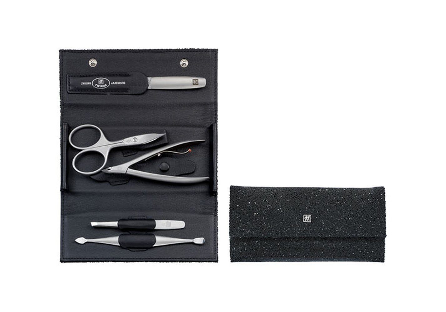 Zwilling Twinox Crystal Druckknopf-Etui, Rindleder, schwarz, 5-tlg. Die Synthese aus hervorragender ZWILLING Verarbeitung und bestem rostfreiem Edelstahl. TWINOX ist die Oberklasse im ZWILLING Beauty Меню. Der matt satinierte, rostfreie Stahl ist resistent gegen Korrosion in Räumen und Ländern mit hoher Luftfeuchtigkeit. Die präzise Verarbeitung sichert langfristig perfekt arbeitende Instrumente. TWINOX – das Beste für gepflegte Hände. 1x Beilegeleporello 1x Druckknopf-Etui lee 1x Kombi-Nagelschere, 93 mm, mattiert, rostfrei 1x Saphir-Nagelfeile, Edelstahl, mattiert, rostfrei, 130 mm 1x Doppelinstrument, mattiert, rostfrei 1x Hautzange, mattiert, rostfrei 1x Pinzette, schräg, mattiert, rostfrei, 90mm