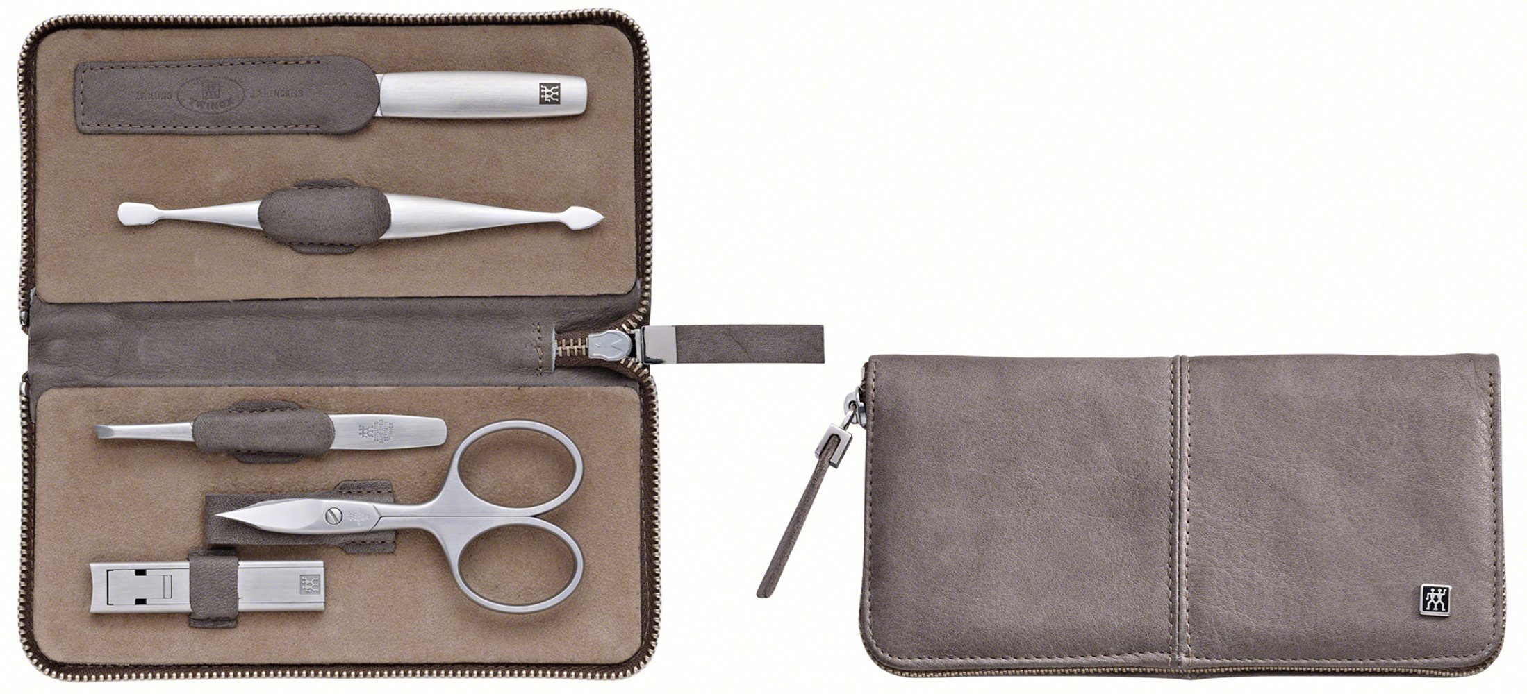 Zwilling TWINOX Taupe Reißverschluss-Etui, Rindleder, taupe, 5-tlg. Die Synthese aus hervorragender ZWILLING Verarbeitung und bestem rostfreiem Edelstahl. TWINOX ist die Oberklasse im ZWILLING Beauty Меню. Der matt satinierte, rostfreie Stahl ist resistent gegen Korrosion in Räumen und Ländern mit hoher Luftfeuchtigkeit. Die präzise Verarbeitung sichert langfristig perfekt arbeitende Instrumente. TWINOX – das Beste für gepflegte Hände. 1x Beilegeleporello 1x Kombi-Nagelschere, mattiert, rostfrei, 90 mm 1x Saphir-Nagelfeile, Edelstahl, mattiert, rostfrei, 130 mm 1x Doppelinstrument, mattiert, rostfrei, 125 mm 1x Pinzette, schräg, mattiert, rostfrei, 90 mm 1x Nagelknipser, 60 mm, mattiert, rostfrei 1x Reißverschluss-Etui, Rindleder, taupe, 5-tlg.