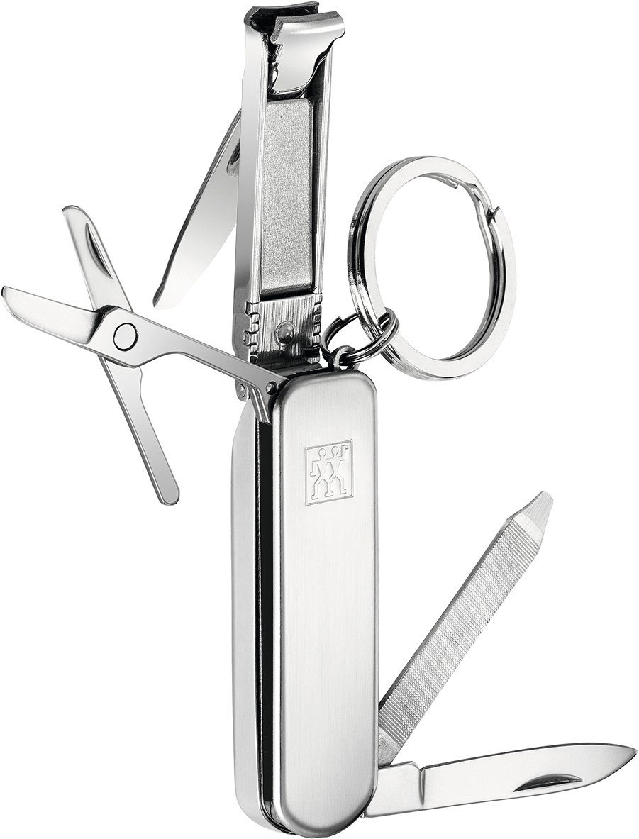 ZWILLING® Classic Inox Multi-Tool, Edelstahl rostfrei 57 x 17 x 10 mm Mit dem Multi-Tool aus der Reihe ZWILLING® Classic Inox sind Sie auch unterwegs optimal für die Nagelpflege ausgerüstet. Das praktische Tool enthält einen Nagelknipser, eine Feile mit einer Spitze zur Nagelreinigung, ein Taschenmesser und eine Schere. Dank des integrierten Schlüsselanhängers tragen Sie das Multi-Tool jederzeit praktisch bei sich. Der rostfreie Edelstahl ist besonders widerstandsfähig und langlebig, weshalb das Produkt auch hoher Luftfeuchtigkeit standhält. Mit dem Multi-Tool aus dem Hause ZWILLING sorgen Sie auch unterwegs stets für ein gepflegtes Erscheinungsbild Ihrer Nägel. Edelstahl rostfrei Poliert mit praktischen Schlüsselanhänger