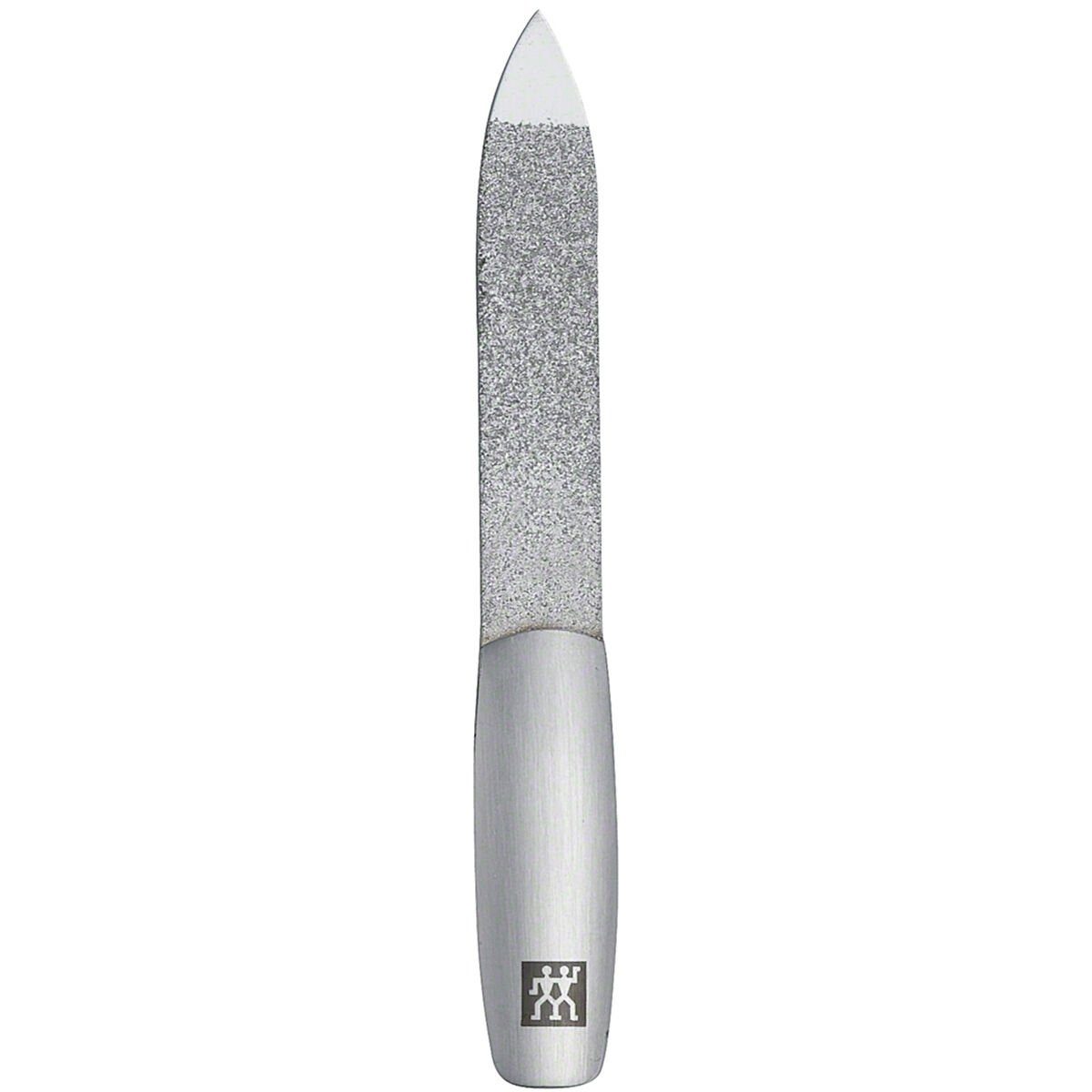 Zwilling TWINOX® Saphir-Nagelfeile 90 mm, Edelstahl, mattiert Hierbei handelt es sich um eine hochwertige Saphir-Nagelpfeile aus dem Hause ZWILLING. Eines der wichtigsten und meist eingesetzten Manicure Instrumente ist die Nagelfeile. Sie gibt es in verschiedenen Ausführungen, Materialien, Größen und Formen. Die Blattspitzen sind meist als Nagelreiniger ausgebildet. Die Feile sollte leicht geneigt und immer nur in eine Richtung unter dem Nagel entlang geführt werden. Die grobe Seite formt, die feine Seite glättet. Die Feilentypen Die Saphirfeile: Das Grundmaterial einer Saphirbeschichteten Nagelfeile ist ein gehärtetes Feilen-Stahlblatt, bei dem scharfkantige Korundkörner oder ähnlich scharfkantiges Schleifmaterial eingebettet werden. Beide Seiten der Feile können unterschiedliche Feiloberflächen grob und fein erhalten. Eine Qualitätsfeile zeichnet sich durch geglättete Feilenblattkanten aus. Die Sandblattfeile: Die Sandblattfeile ist ein Einfachprodukt mit relativ kurzer Gebrauchsdauer. Der Feilenkörper besteht aus Papierschichten, Pappe oder einem dünnen Holzblatt. Sandblattfeilen sind mit grober und feiner Körnung beschichtet. Zum Formfeilen und Nachfeilen eignet sich die feine Seite. Sie sind jedoch oft etwas grob im Feilbild und hinterlassen kleine Feilriefen.