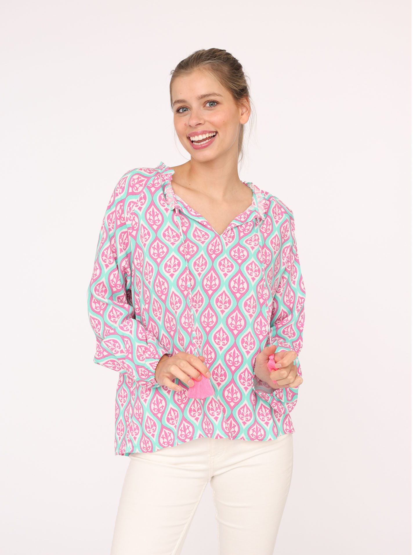 Beruflich oder privat — mit dieser Bluse »Ovale Ranken« von Zwillingsherz bist du modisch gesehen für alle Veranstaltungen gerüstet.