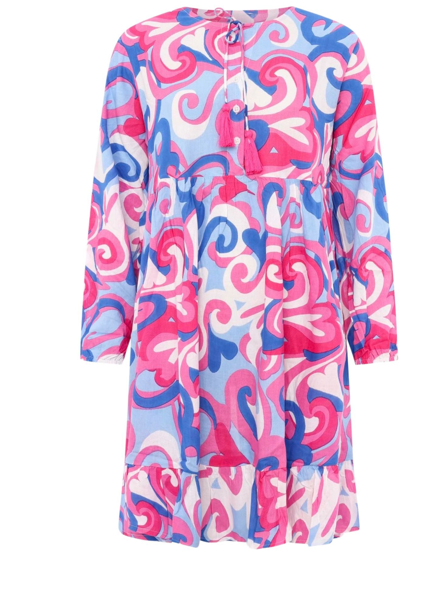 Zwillingsherz Kleid Herzen & Kringel Размер S/M: Длина: 96cm ; Brustumfang: 104cm ; Ärmellänge: 56cm L/XL: Длина: 96cm ; Brustumfang: 114cm ; Ärmellänge: 58cm Farbe pink blau oder pink orange Material 100 % Viskose Details: elastisches Armbündchen, Knopfleiste, Kordel mit Tasseln Pflege-Hinweise: Handwäsche; kalt; nicht Trockner geeignet Stilvoll und komfortabel zugleich: Dieses Tunikakleid begeistert mit einem lebendigen Paisley-Muster, einer raffinierten Knopfleiste und elastischen Armbündchen. Die 100%ige Viskose sorgt nicht nur für ein angenehmes Tragegefühl, sondern auch für einen modischen Auftritt.