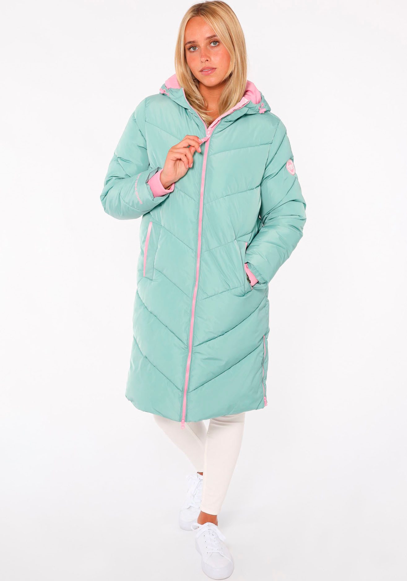 Dieser Steppmantel »Positive Mind« von Zwillingsherz bringt dich gut durch kühle und windige Tage. Die langen Ärmel enden in einem angesetzten Bündchen, sodass du sie auch leicht hoch geschoben tragen kannst, ohne dass sie wieder herunterrutschen. Der Steppmantel ist knielang geschnitten. Die Kapuze ist mit einem Elastikband regulierbar. Dank der Fütterung bleibt dein Kopf warm. In den Seitennahttaschen kannst du deine Wertsachen praktisch verstauen.