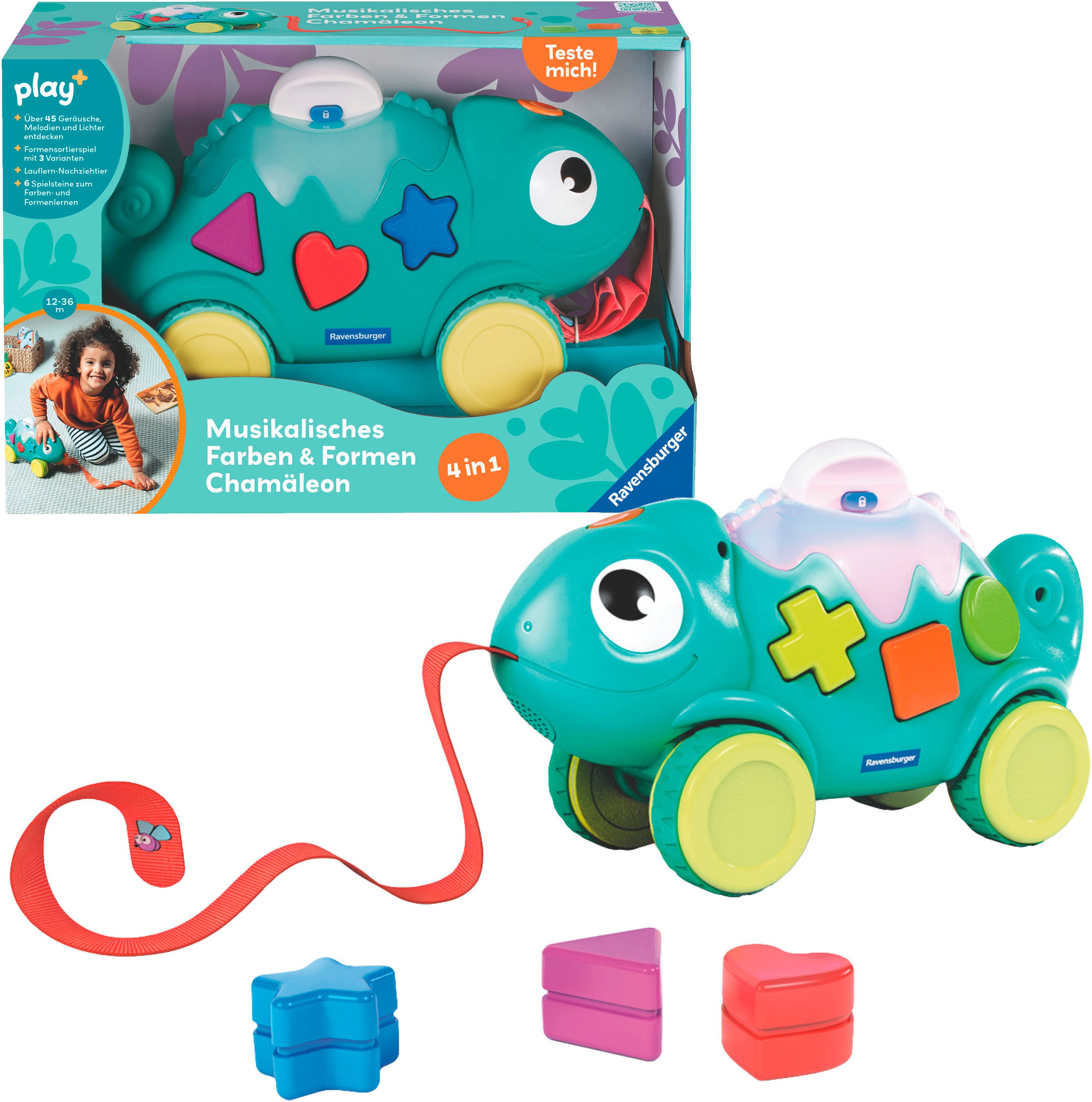 Ravensburger Steckspielzeug Play+ Musikalisches Farben & Formen Chamäleon, Made in Europe