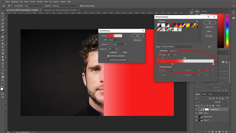 Dein Foto ist nun bereit für den Neon-Glow-Effekt. Der erste Schritt besteht darin, zwei verschiedene Farbverläufe anzulegen. Die Farben hierfür kannst du selbst aussuchen – Hauptsache, sie unterscheiden sich möglichst stark. In unserem Beispiel arbeiten wir mit dem Kontrast-Farbpaar Rot und Cyan.