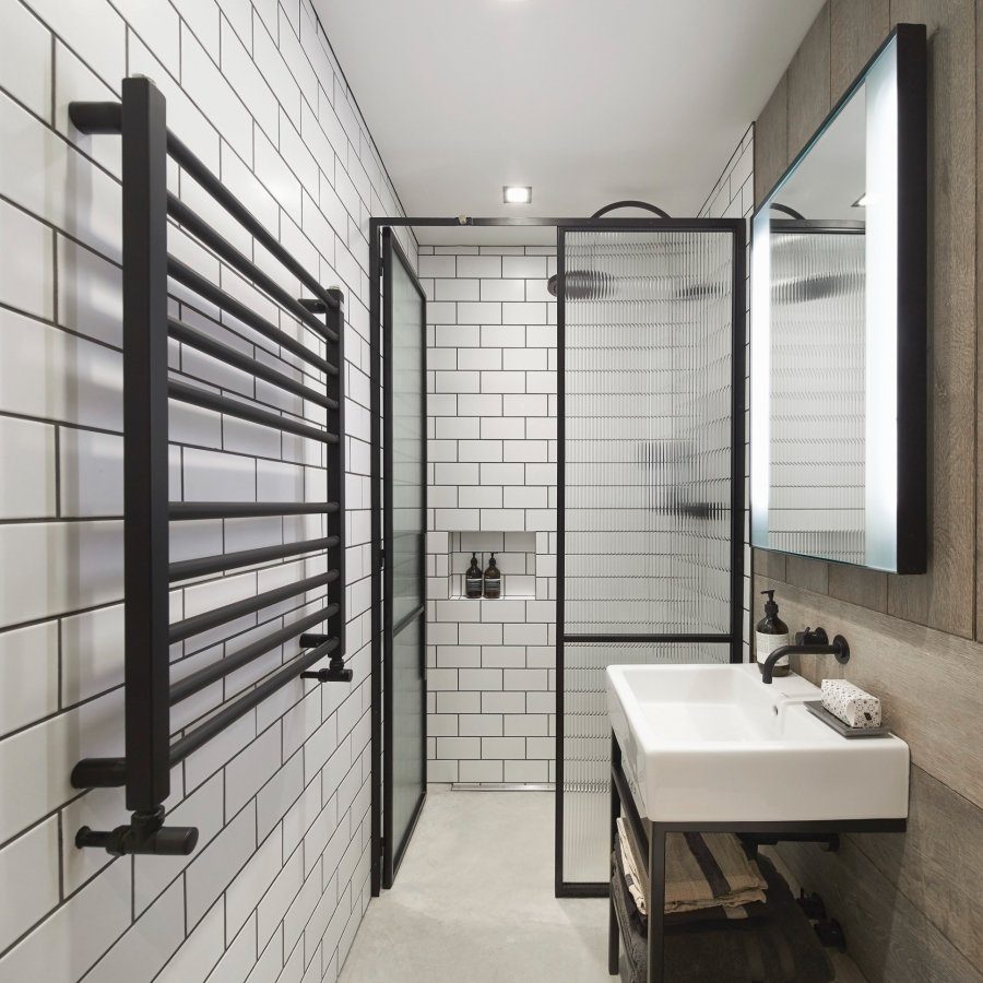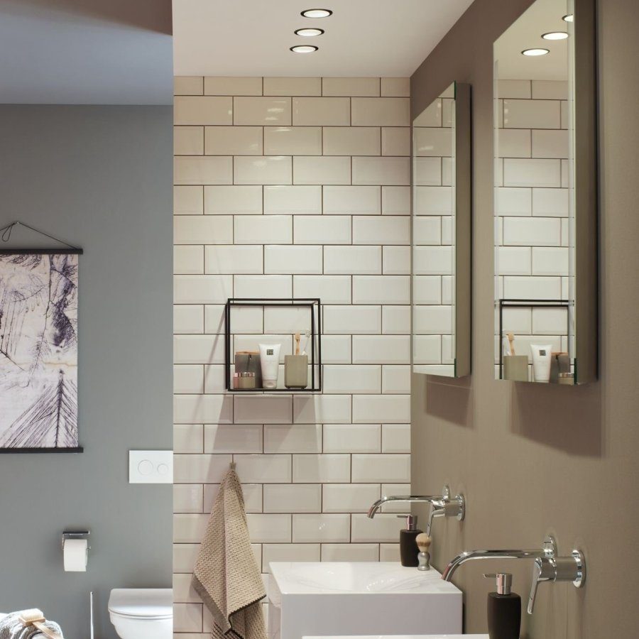 Um ein Bad ausreichend zu beleuchten, benötigst du mindestens 270 Lumen (lm) pro qm. Diese Helligkeit erreichst du zum Beispiel in einem 12-qm-Bad mit fünf bis sechs Deckenspots à 460 lm. Meist kommen im Bad aber noch die Spiegelbeleuchtung und vielleicht eine Wandlampe dazu, sodass du an der Decke normalerweise mit vier Deckenspots auskommst.