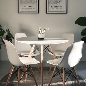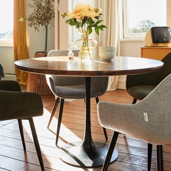 Für einen kleinen Essbereich im Wohnzimmer oder in der Küche eignet sich ein runder Tisch am besten. Er nimmt wenig Platz ein, bietet aber trotzdem genügend Sitzplätze. Schalenstühle sehen besonders gut dazu aus.