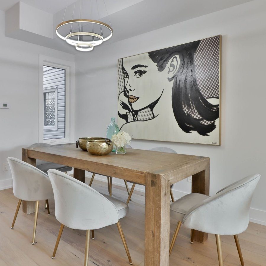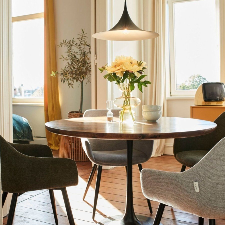 Мягкие стулья-ракушки делают его удобным за обеденным столом