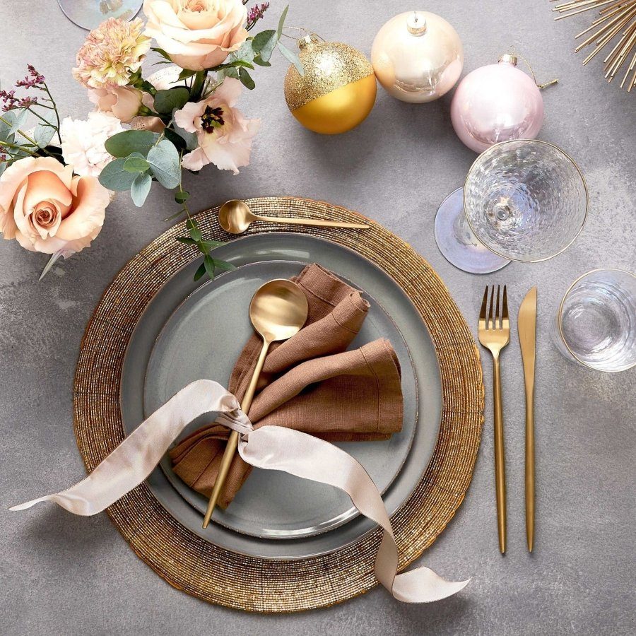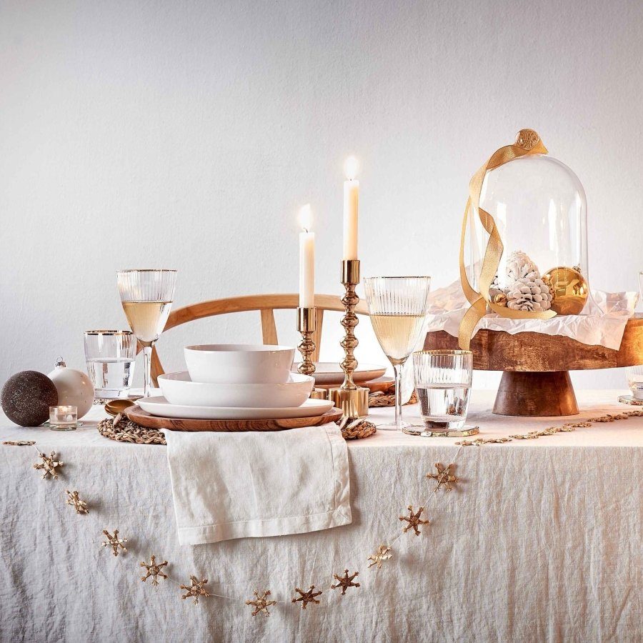 Kombiniere auf der Weihnachtstafel Gold mit hellen Naturtönen wie Holz, Leinen und Stein – so wird es festlich, aber nicht zu formell.