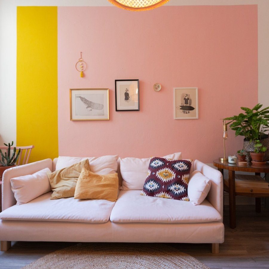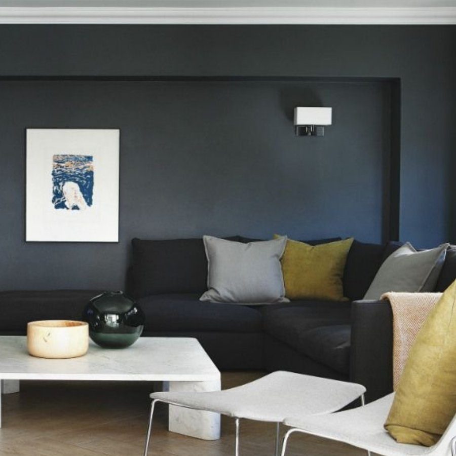 In kleinen Räumen solltest du nur eine oder zwei Wände farbig streichen und die restlichen Wände weiß lassen. Grundsätzlich gilt: Keine Angst vor dunklen Farben – insbesondere dunkle Blau- und Grüntöne lassen dein Wohnzimmer ruhiger und ausgeglichener wirken.